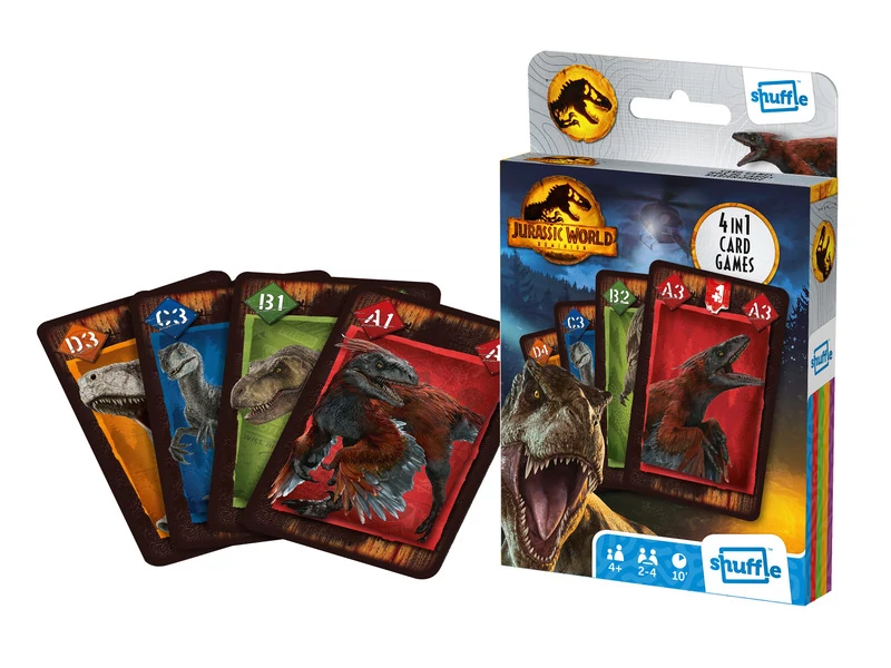 A Jurassic World 4 az 1-ben kártyajáték négy klasszikus játékot kínál egy pakliban (snap, párok, boldog családok és egy akciójáték), így változatos kihívásokat nyújt minden alkalomra.A kártyákon ikonikus dinoszauruszok képei találhatók, amelyek közben segítenek megismerni a dínó fajtákat is.